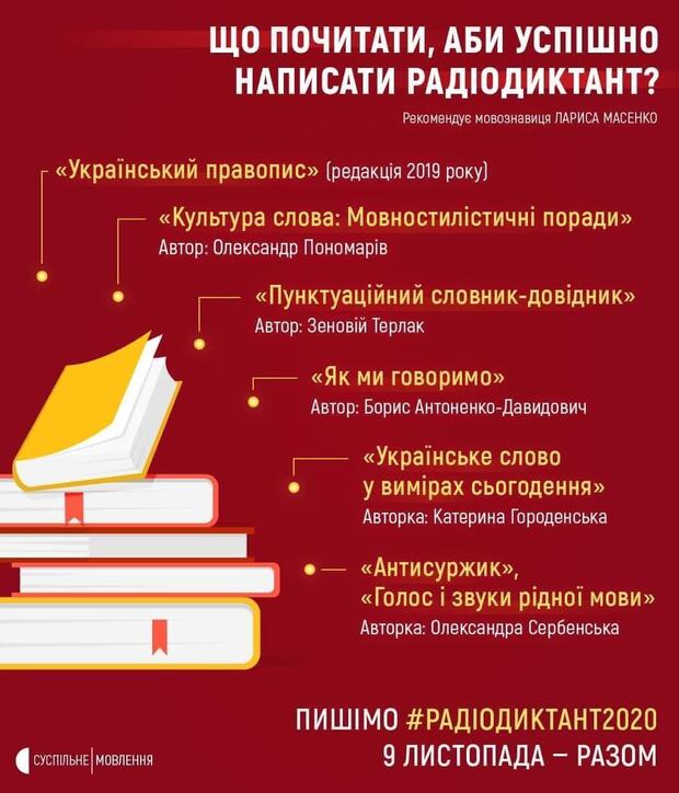 Для успішного написання диктанту у 2020 році наукова консультантка Радіодиктанту Лариса Масенко рекомендує передусім ознайомитися з новим Українським правописом 2019 року, а також з кількома книжками та посібниками з української мови.