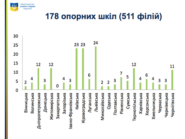 Вона повідомила, що до трійки регіонів з найбільш неефективною мережею шкіл на сьогодні входять: Чернігівська, Сумська та Кіровоградська області.