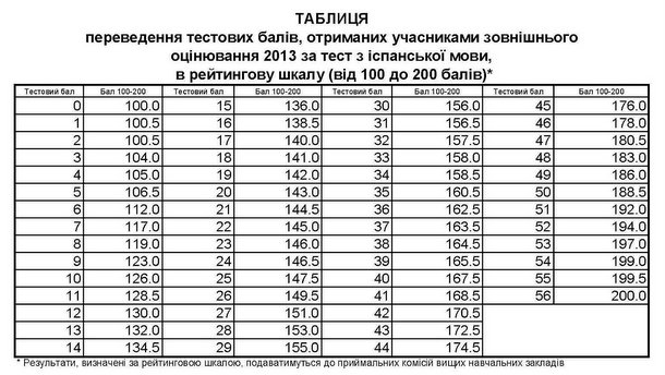За результатами тестування Українським центром оцінювання якості освіти оприлюднена таблиця переведення тестових балів, отриманих учасниками зовнішнього незалежного оцінювання за тест з іспанської мови у 2012 році, у рейтингову шкалу (100–200 балів).