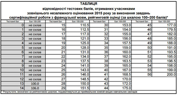 За результатами тестування Українським центром оцінювання якості освіти оприлюднена таблиця переведення тестових балів, отриманих учасниками зовнішнього незалежного оцінювання за тест з французької мови у 2015 році, у рейтингову шкалу (100–200 балів).