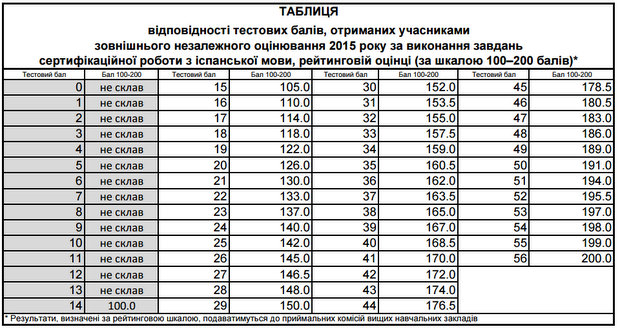За результатами тестування Українським центром оцінювання якості освіти оприлюднена таблиця переведення тестових балів, отриманих учасниками зовнішнього незалежного оцінювання за тест з іспанської мови у 2015 році, у рейтингову шкалу (100–200 балів).