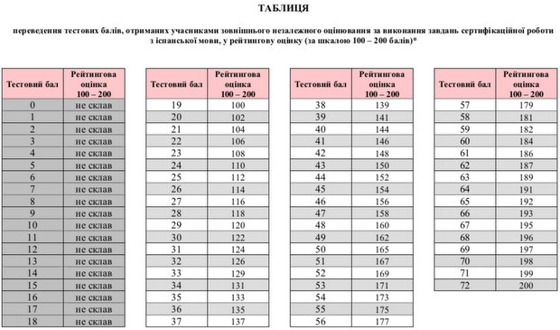 За результатами тестування Українським центром оцінювання якості освіти оприлюднена таблиця переведення тестових балів, отриманих учасниками зовнішнього незалежного оцінювання, у рейтингову шкалу (100–200 балів).