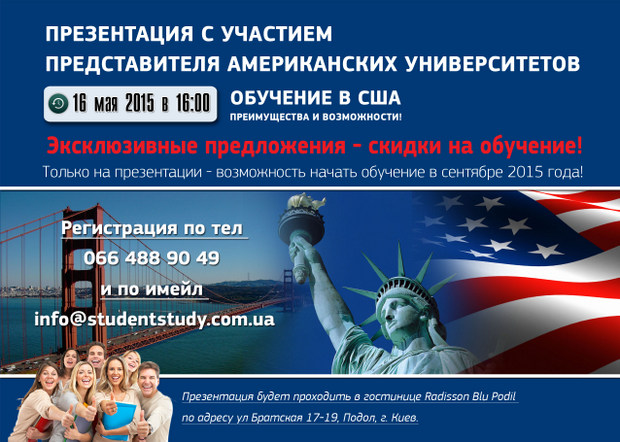 Тоді ви можете відвідати безкоштовний семінар-презентацію, на якому зможете отримати вичерпну інформацію стосовно всіх доступних можливостей навчання в США, починаючи від навчання в середній школі і закінчуючи університетською та післядипломною освітою.