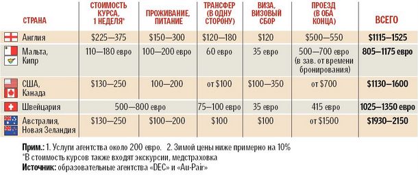 Зимой же "высокий" сезон учебных туров перемещается в Швейцарию, где курсы совмещают с катанием на лыжах и сноубордах, правда, обойдется это недешево. Зато изучение английского в Англии зимой выйдет дешевле, чем летом. В Канаде английский считается наиболее универсальным, без акцента, и побывав там, можно все разузнать о возможной учебе в вузе, которая считается одной из самых качественных и дешевых в мире. А в Швейцарию едут с прицелом на получение образования в области отельного бизнеса. Реже всего украинцы решаются на вояж в Австралию и Новую Зеландию, где расценки и преподавание сопоставимы с США и Канадой, но перелет вдвое дороже. (см. табл.)
