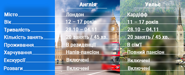 Осінні канікули в Англії передбачають навчання та проживання в Лондоні на базі David Game College. Школа знаходиться в самому центрі міста, тому, крім занять, тут кожен день передбачені екскурсії найвідомішими визначними пам’ятками столиці: Мадам Тюссо, Музей-підземеллі London Dungeons, Музей природознавства, Театр Шекспіра «Глобус», Королівський тур столичними пам’ятками з професійним гідом і багато іншого. У суботу ж дітей чекає екскурсія на весь день в Оксфорд. А найприємніше, що всі вхідні квитки вже входять у вартість програми!