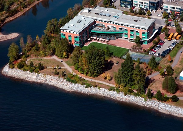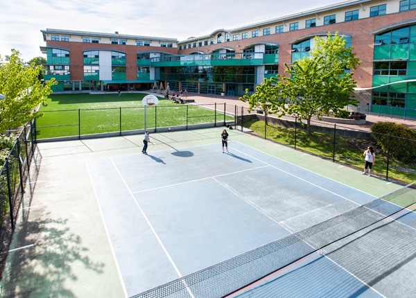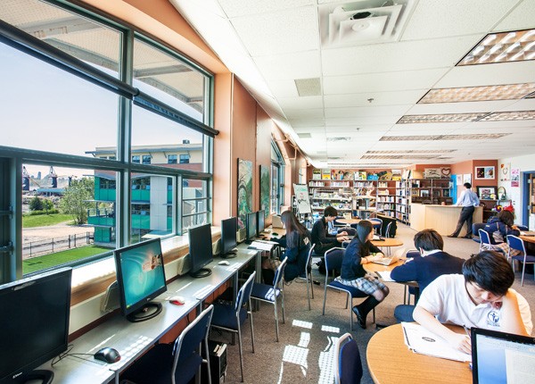 Кампус школи був зданий в експлуатацію у вересні 2003 року. Південна сторона школи виходить скляною стіною на великий двір, з'єднаний із сусіднім парком і набережною. В школі є багатоцільовий спортивний зал, критий басейн, тенісний корт, театр презентацій, музичний салон, бібліотека, а також бездротовий Інтернет.