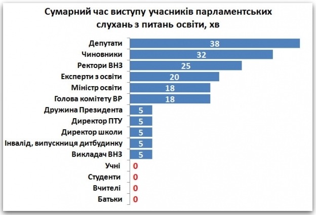 Статистика — невблагана річ: левову частину часу виступів (70 хвилин з 180) забрали спічі депутатів та чиновників, які й так мають безліч можливостей висловити свою думку під час безкінечної балаканини у міністерствах та комітетах.