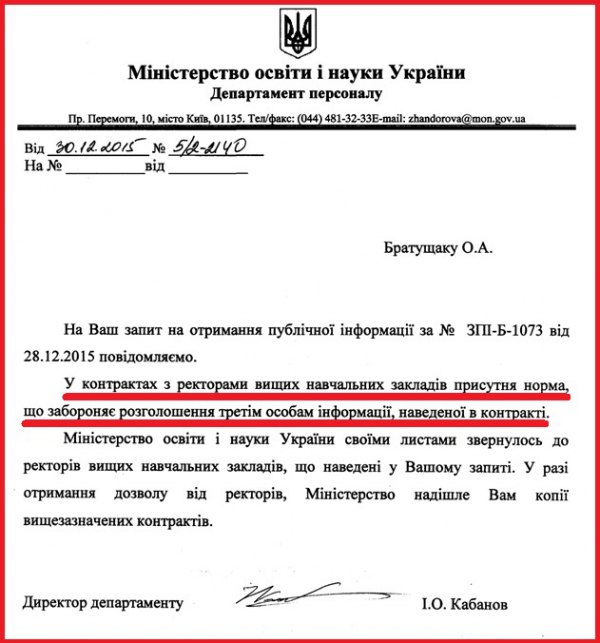 У листі відповіді директор департаменту персоналу Ігор Кабанов вказав, що "у контрактах з ректорами ВНЗ присутня норма, що забороняє розголошення третім особам інформації, наведеної в контракті". І нібито міністерство звернулося до ректорів з листом, щоб вони надали дозвіл на оприлюднення контрактів.