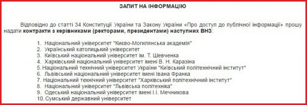 Перший такий запит надсилав рівно 4 місяці тому. Просив контракти ректорів цих же 10 вишів. У відповідь отримав відписку, що нібито у цих контрактах є норма, яка забороняє розголошення третім особам інформації, яка міститься у контрактах.