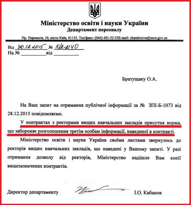 По суті це була відписка. Але цією відповіддю працівник Міносвіти також повідомив, що відомство звернулося до ректорів для отримання дозволів на надання мені копій. Минуло більше трьох місяців, а відповіді ректорів Міносвіти мені так і не надало.