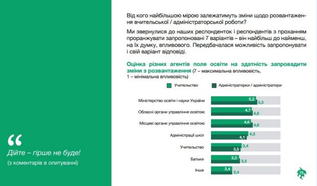 Потрібно навсправжки братись за реформування освіти «знизу». Бо хто б не був міністром чи начальником місцевого управління освіти, насправді за зачиненими дверима своєї школи освітню політику визначає її директор. І хто б не був директором школи, за зачиненими дверима свого класу, лише від вчителя залежить, як вивчатиметься той чи інший предмет у цій школі.