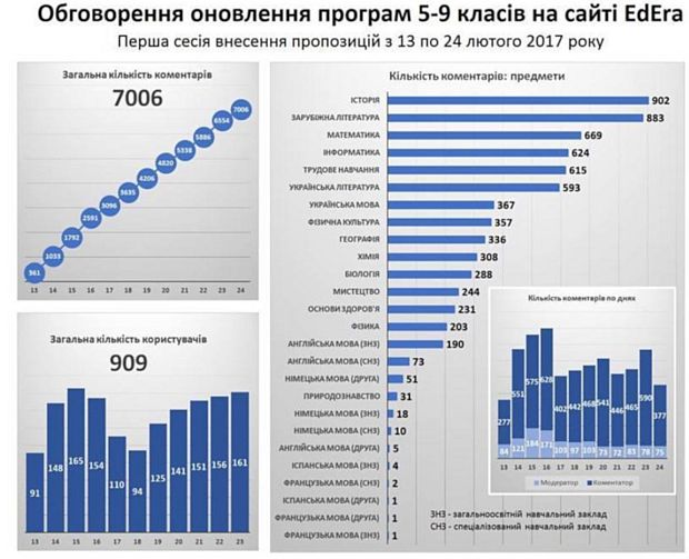 За 11 днів обговорення на порталі ЕдЕра ми зібрали 7 тисяч 6 пропозицій, загалом долучилося 909 авторизованих користувачів. Найбільше обговорюють Історію (902 пропозиції), Зарубіжну літературу (883 пропозиції) та Математику (669 пропозицій). Найменше, на жаль, іноземні мови.