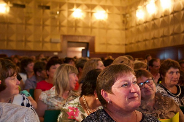 Та велика - більше ніж на 550 осіб у Великомихайлівці з освітянами Захарівського, Великомихайлівського,Роздільнянського, Окнянського, Іванівського, Ананьївського та Подільського районів. Мені сказали, що вчителі ще з одного району приїхали з власної ініціативи та без попередження, і тому їм довелося сидіти на додаткових стільчиках у проході, але я, на жаль, забула уточнити з якого.