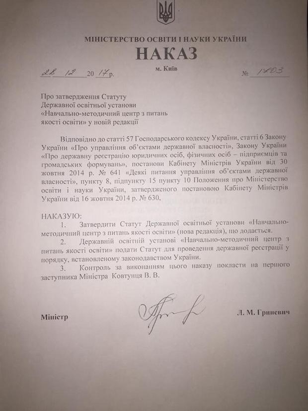 В останні дні 2017 року міністр освіти і науки п. Лілія Гриневич затвердила новий Статут нашого Центру. Відтепер нашою головною функцією стає проведення освітніх експертиз та надання методичної допомоги в розбудові внутрішніх систем забезпечення якості освіти. У системах дошкільної, загальної середньої та професійної освіти.