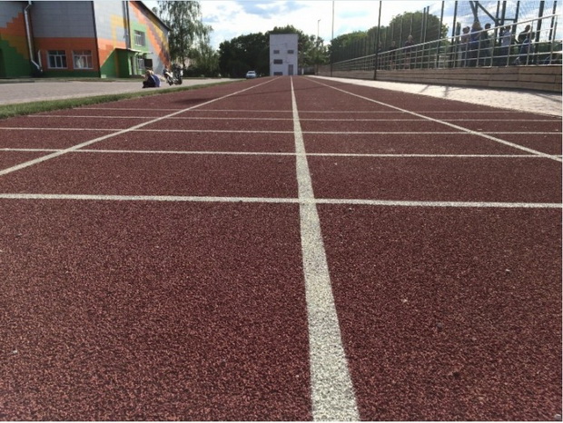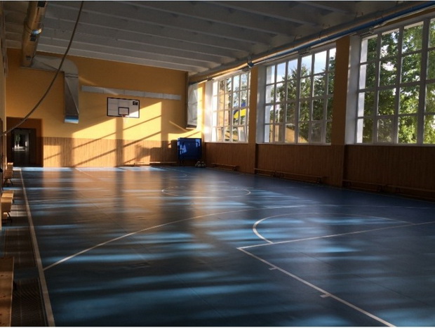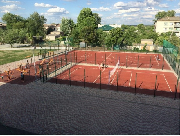 А це їхні спортивні майданчики: тренажерний, баскетбольний та волейбольний. Всюди гумове покриття. Плюс два футбольних поля - стандартне та для міні-футболу. З штучним ворсистим газоном, дуже приємним на дотик. Бігові доріжки - гумові. Гумове покриття навіть у спортзалі, що знаходиться в самому приміщенні школи.