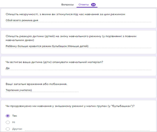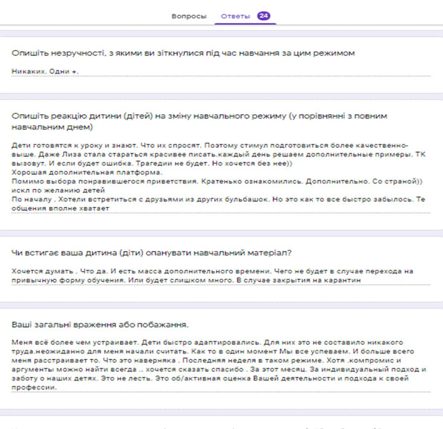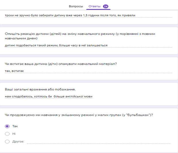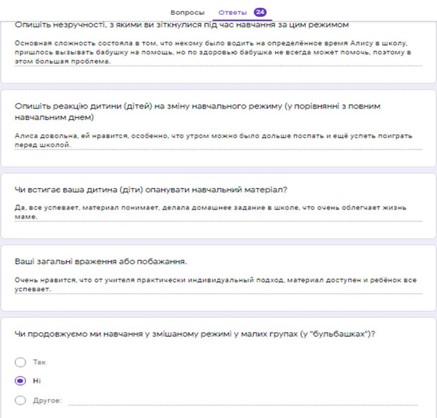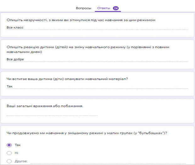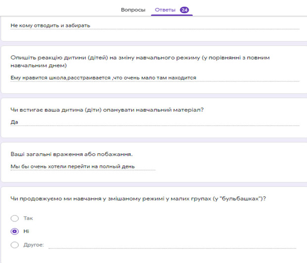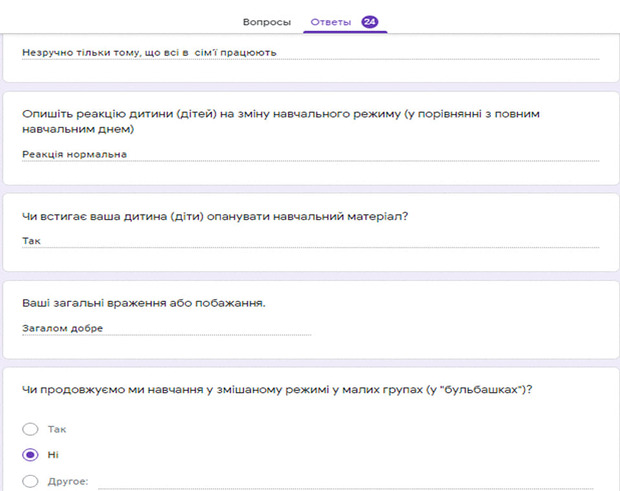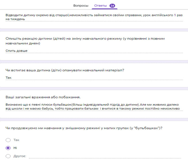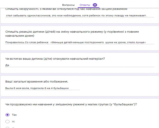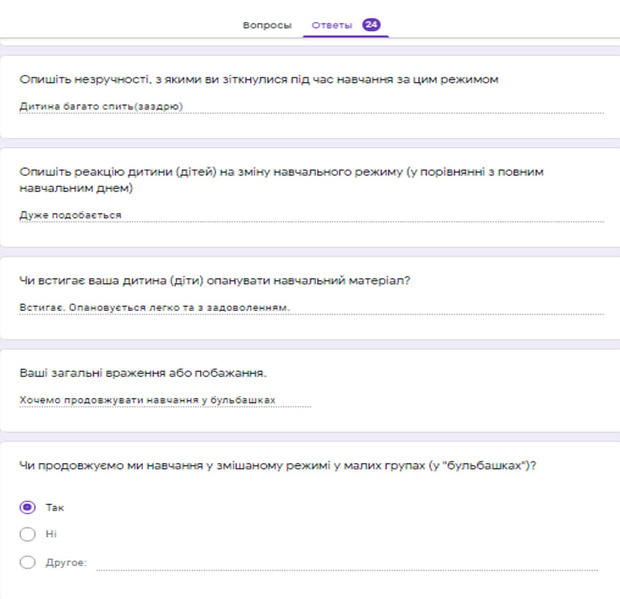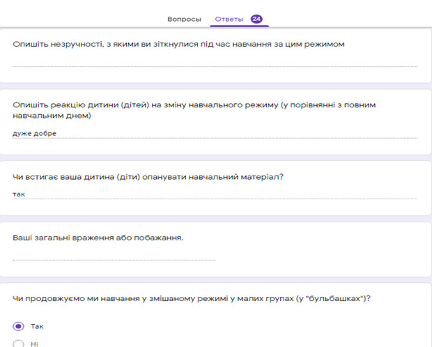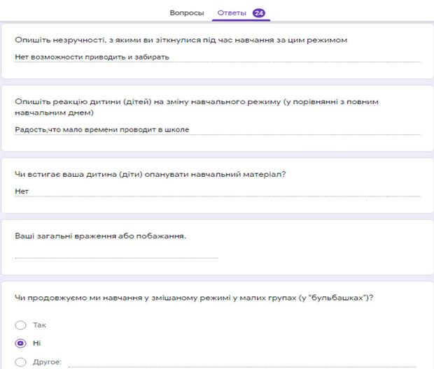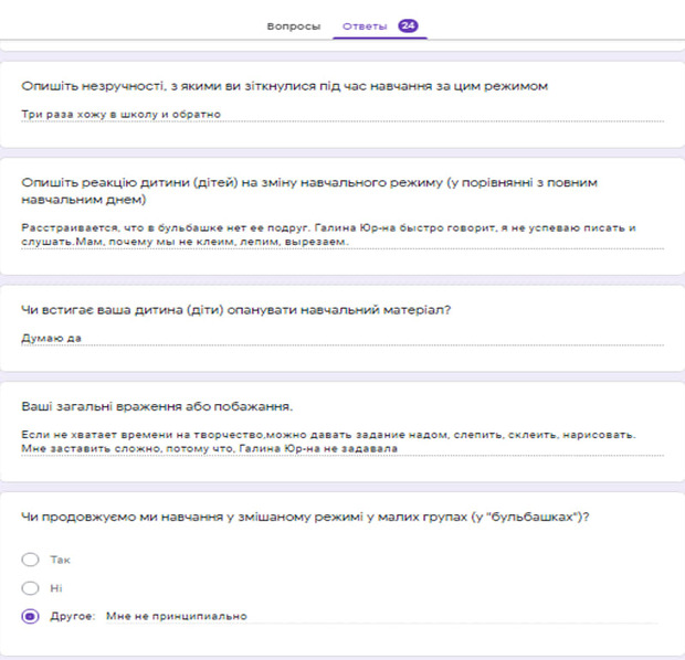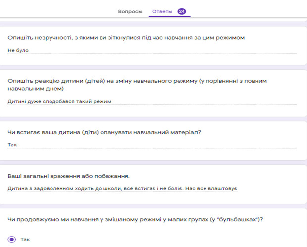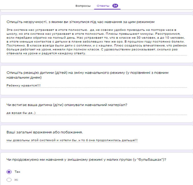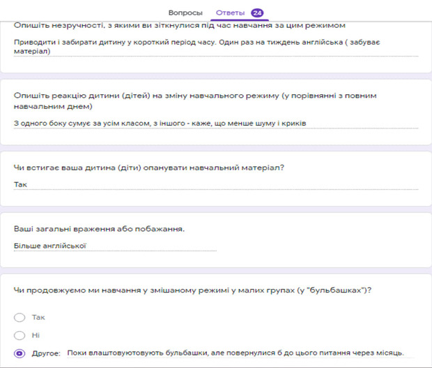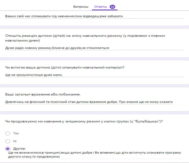 На початку експерименту ми з батьками домовились провести опитування щодо доцільності впровадження режиму на весь період карантину в кінці вересня. Усі подібні опитування я вже давно проводжу за допомогою Google форм. Анонімність - єдина умова правдивості і достовірності інформації. Мені важливий ефективний зворотній зв'язок від батьків. На нього і будемо спиратися (з усіма відповідями ви можете ознайомитись на фото).