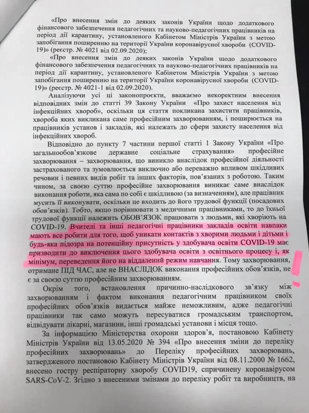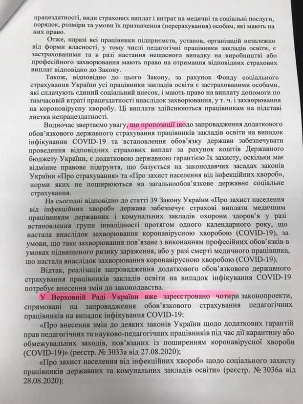 По-перше, як завжди, ми чуємо, що зареєстровані законопроекти чекають розгляду у Верховній Раді України. Чому подбати про людей не можна було з 12 березня 2020 року? Натомість ВР приймає набагато «важливіші» рішення, ніш захист учасників освітнього процесу. У листі було подано низку законопроектів, які, на думку МОН, допоможуть захистити працівників освіти. МОН вважає, що не потрібно вносити зміни до ст. 39 Закону України «Про захист населення від інфекційних хвороб».