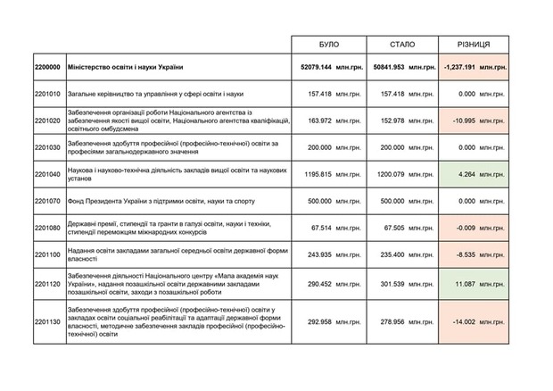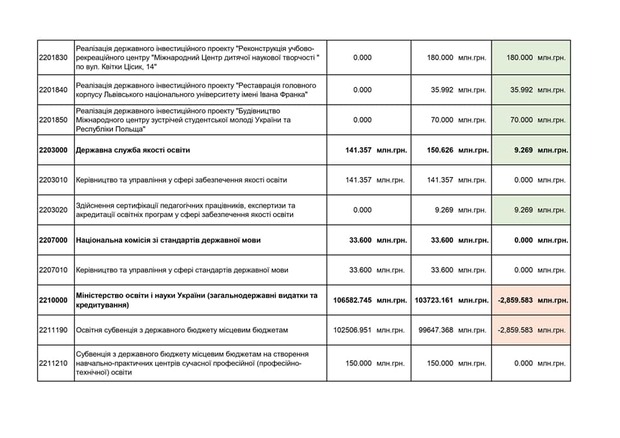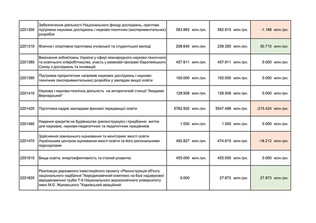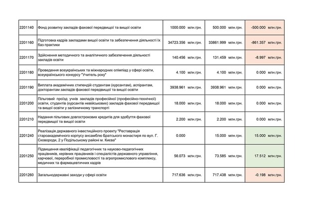 - Фонду розвитку закладів передвищої і вищої освіти (мінус 500 мільйонів, які пішли б на капітальний ремонт гуртожитків чи на обладнання для навчання);