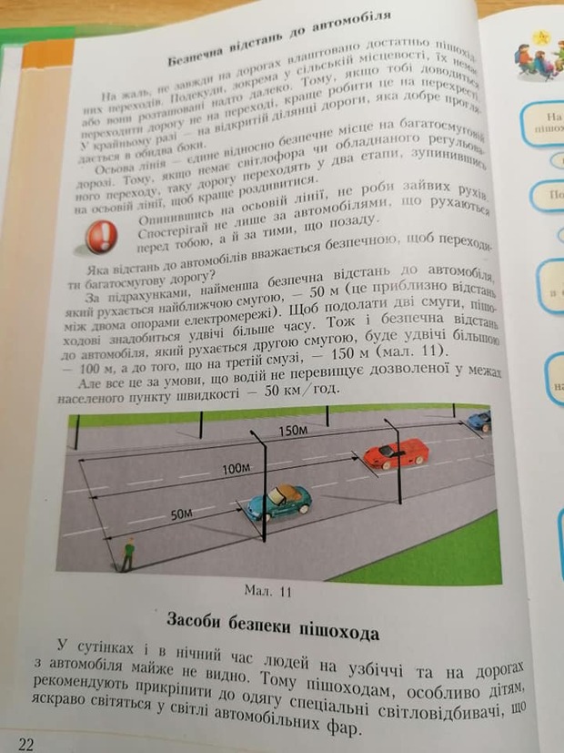Після прочитання іншого підручника діти запам’ятають, що можна перебігати багатосмугові магістралі з «відносно безпечними осьовими лініями». Навіть якщо ця інструкція коректна з точки зору ПДР, чи правильні в ній акценти? Це читають діти з Києва, де є проспект Бажана та Столичне шосе. Уявіть, якщо вони почнуть їх перебігати?