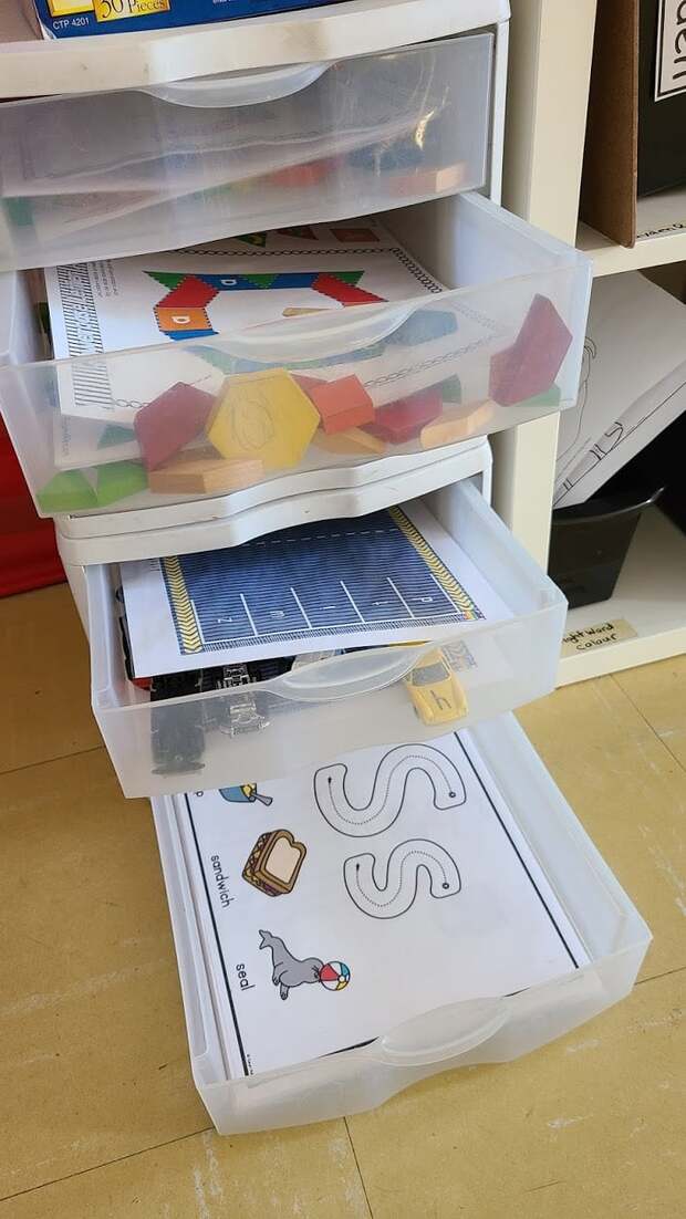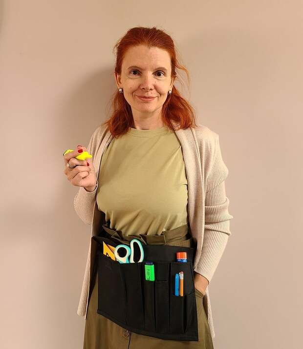 - Щоб швидко роздати олівці, папірці та й будь-які матеріали для малювання, конструювання чи дослідів, використовують «візочки-полички». Щоб не бігати до столу за ножицями, ручкою чи маркером, учителі одягають «пояс для інструментів» (я собі теж придбала).