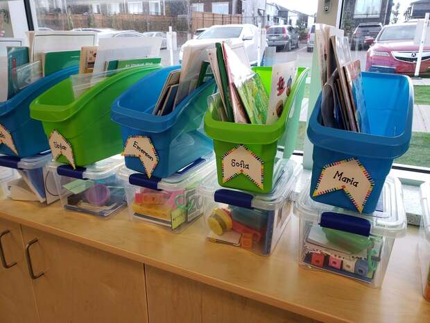 - Кожен учень має підписану папку чи пластиковий контейнер з книжками для читання мовчки, зошитами чи роздатковим матеріалами (пам'ятка для письма, гра). У понеділок зранку учні по черзі обирають 5 книжечок з класної бібліотечки, у п'ятницю ці книжечки здають.