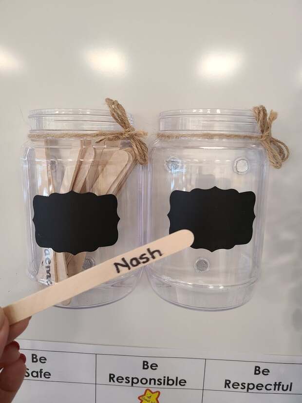 Кого спитати? Хто буде першим? Щоб легко зробити вибір, вчителі мають 2 баночки з дерев'яними паличками (як для морозива). На кожній паличці написане ім'я учня, і випадково вийнята паличка визначає, хто саме, їх просто перекладають з баночки в баночку.