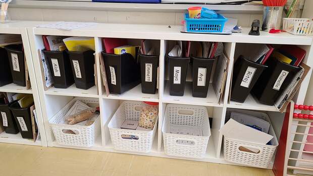 Учні Шони у цих папках тримають усі зошити. «Візьміть зелений, жовтий, червоний зошит», – каже Шона, і діти з папок біля дошки самі дістають необхідний.