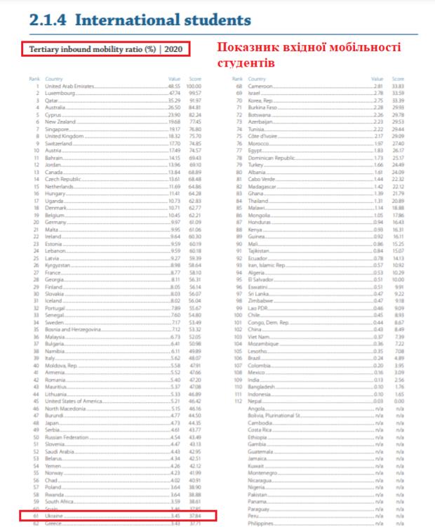 А ось за показником вхідної мобільності студентів (іноземні громадяни, які навчаються в країні) Україна займає 61 місце, і дуже дивно бачити, що ми тут поступаємося….Уганді (17 місце), Намібії (38), Бурунді (47), Чад (56), Руанді (58). Варто запитати: хто, коли і чому довів нашу систему вищої освіти до такого стану, що за своєю привабливістю на міжнародному або регіональних ринках вона поступається системам вищої освіти країн Африки?