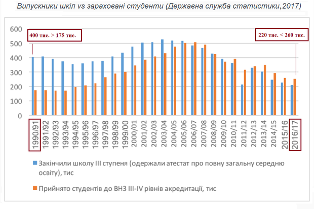 Як можна пояснити той факт, що зараз кількість першокурсників закладів вищої освіти перевищує кількість випускників середніх шкіл (за даними 2017 року – на 20%), при цьому у 1990 році ситуація була зовсім іншою: кількість випускників шкіл перевищувала кількість першокурсників більш ніж удвічі?