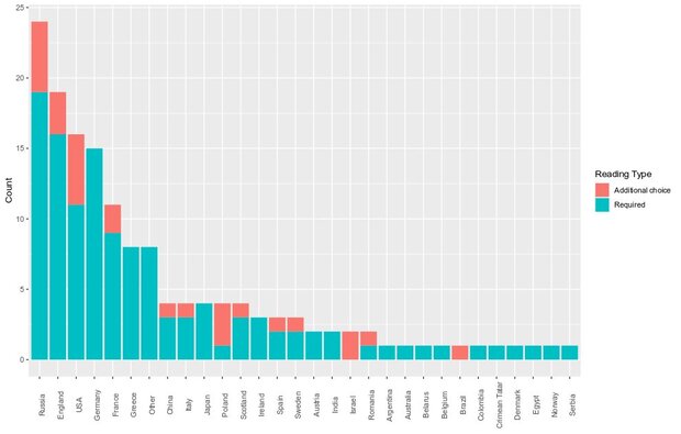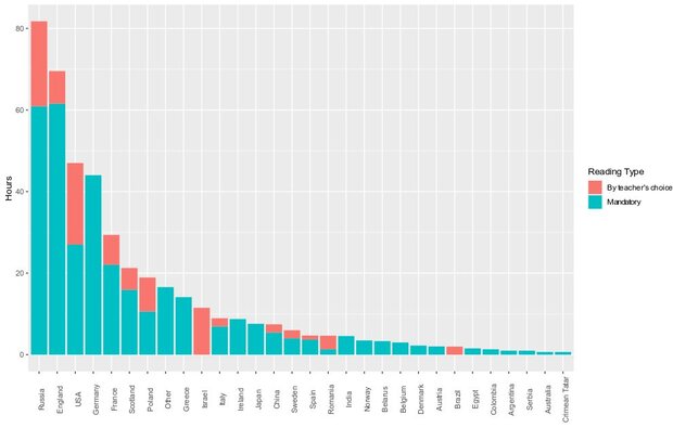 Російські твори домінують у обов’язковій програмі зарубіжної літератури і за кількістю творів (24% з усієї програми; для порівняння – лише 2% кращих творів усіх часів згідно з The Guardian належать росіянам), і за годинами, які відведені на їх вивчення.