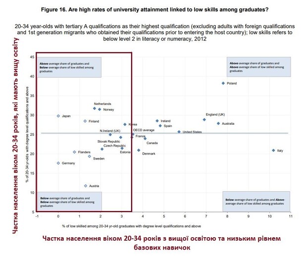 Вартими уваги є дані Організації Економічного Співробітництва та Розвитку (OECD). У країнах з більшим охопленням населення вищою освітою – більша частка низькокваліфікованих випускників університетів. Японія, Німеччина, Бельгія, Фінляндія, Швеція, Австрія, Нідерланди та Норвегія мають найменшу частку низькокваліфікованих випускників – до 2%. Найбільшу частку низькокваліфікованих випускників мають Італія та Польща – 10,1% та 7,8% відповідно. США мають 5,7%.