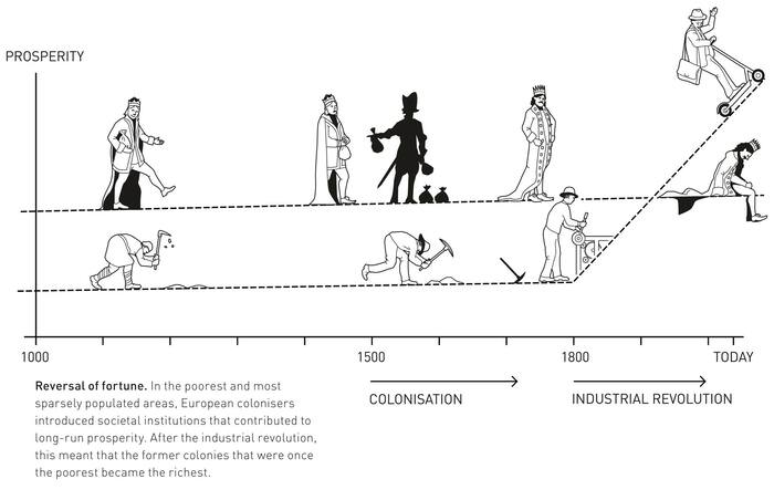 Інклюзивні (із залученням до формування та розподілу добробуту) інститути часто запроваджувалися в країнах, які були бідними на момент колонізації, що з часом призводило до загального процвітання населення (як у США). Це є важливою причиною того, чому колишні колонії, які колись були багатими, зараз є бідними, і навпаки