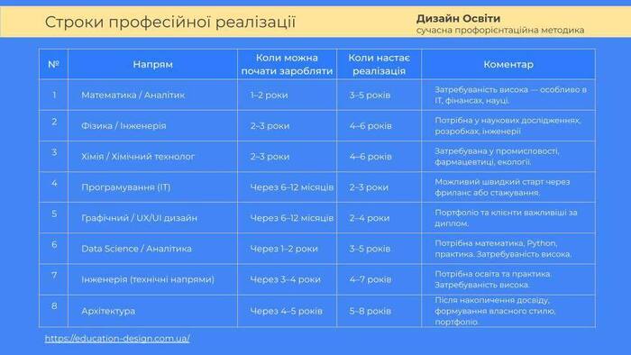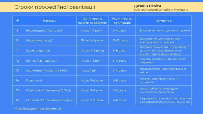Зробила порівняльну таблицю професій із приблизними строками професійної реалізації – з урахуванням не лише тривалості навчання, але й часу до досягнення стабільного доходу та впевненості у професії і першої можливості заробити.
