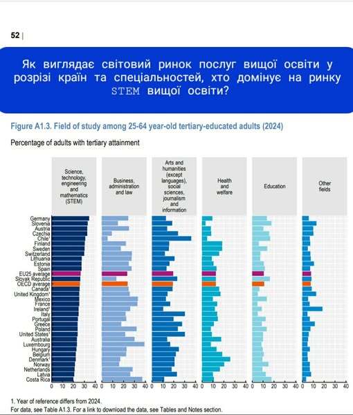 Німеччина, Словенія, Австрія та Чехія помітно спеціалізуються на підготовці фахівців з вищою освітою у галузі STEM – більше 30% власників дипломів про вищу освіту у віці від 25 до 64 років є випускниками саме STEM освітніх програм.