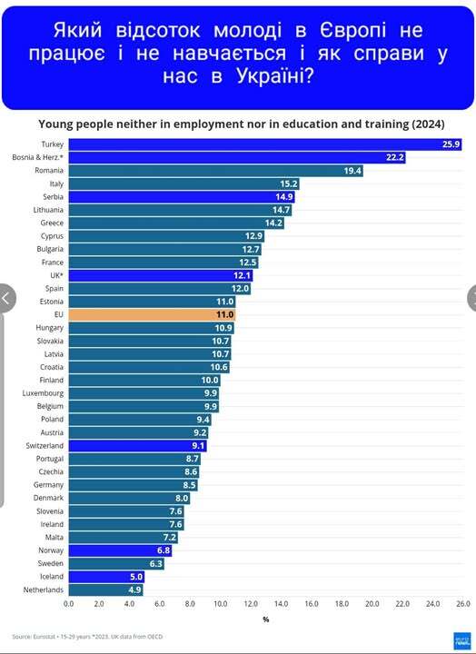За даними Євростату, у 2024 році частка молодих NEET в ЄС коливалася від 4,9% у Нідерландах до 19,4% у Румунії. Різниця у відношенні у цих двох країнах до молоді як людського капіталу, у який потрібно інвестувати і який має бути продуктивним, очевидна – Нідерланди далеко попереду Румунії.