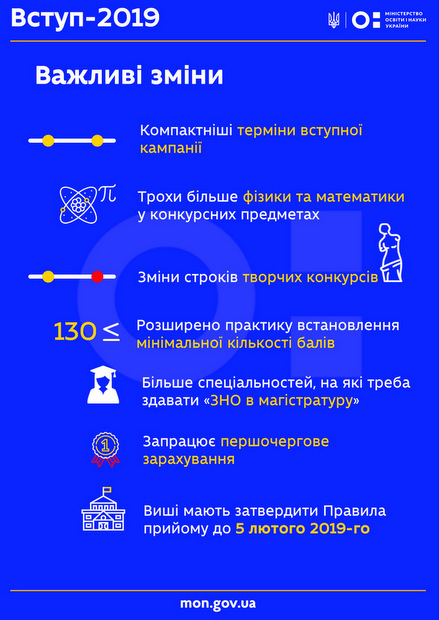 Окремо він наголосив, що через незалежні від МОН затримки з реєстрацією Умов прийому змінено граничний термін, до якого заклади вищої освіти мають затвердити власні Правила прийому. Тепер вони мають це зробити до 5 лютого 2019 року. На середину січня МОН планує провести серію регіональних нарад щодо роз’яснення Умов прийому, графік яких буде оприлюднено незабаром.