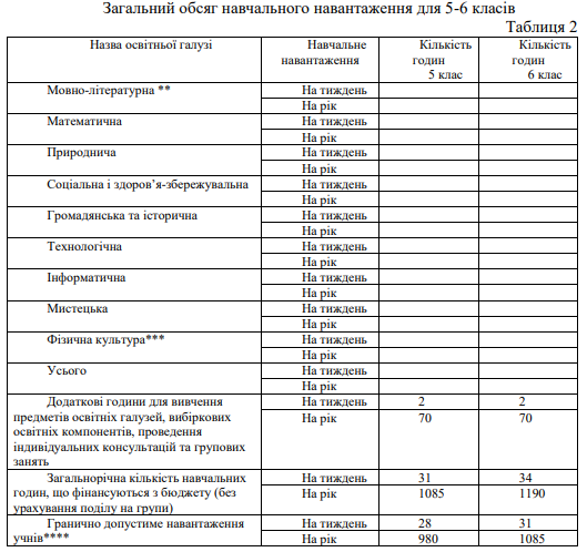 Керуючись показниками загальної кількості навчального навантаження, визначеними в Таблиці 1 за галузями, заклад освіти визначає обсяг фактичного річного навантаження для 5-6 класів, заповнивши колонку «Кількість годин» у Таблиці 2.