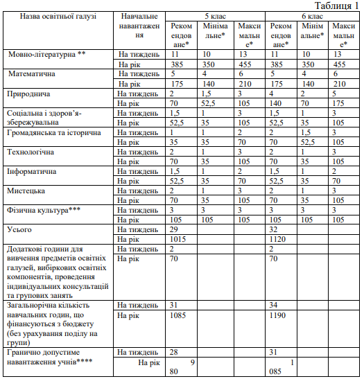 Загальний обсяг річного навчального навантаження для закладів із навчанням українською мовою (5-6 класи) згідно з типовим планом наведено в Таблиці 1.
