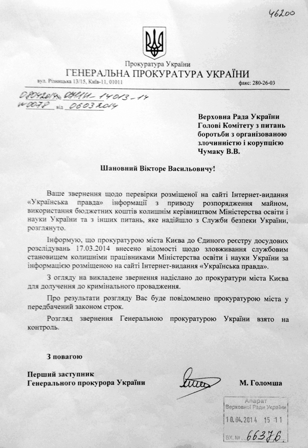 "Ваше звернення щодо перевірки розміщеної на сайті Інтернет-видання "Українська правда" інформації з приводу розпорядженням майном, використання бюджетних коштів колишнім керівництвом Міністерства освіти і науки України та з інших питань, яке надійшло з Служби безпеки України, розглянуте", - йдеться у листі першого заступника Генерального прокурора України Миколи Голомши.