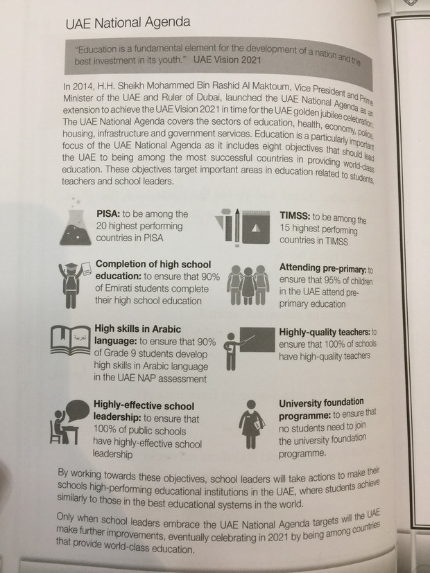 Пранжала відкриває щоденник одного з учнів і показує мені викладені англійською і арабською мовами цілі, над якими працюють всі учасники освітнього процесу. Згідно Національного плану і бачення на 2021, ОАЕ мають увійти до топ-20 країн за результатами PISA, топ-15 країн за результатами TIMSS (Trends in International Mathematics and Science Study), 100% шкіл повинні мати висококваліфікованих вчителів і т. ін. Спільна мета усієї країни — увійти в топ-5 найщасливіших країн світу за міжнародним рейтингом щастя.