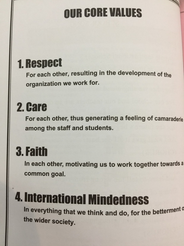 В щоденнику також викладено спільні для всіх учасників освітнього процесу цінності: повага, турбота, віра та орієнтація та міжнародність (глобальне мислення).