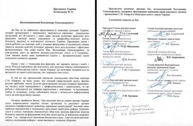 Лист підписаний президентом Спілки ректорів вищих навчальних закладів Леонідом Губерським, головою Асоціації ректорів технічних навчальних закладів Михайлом Згруровським, головою Асоціації представників аграрних навчальних закладів Станіславом Ніколаєнко, президентом Академії педагогічних наук Василем Кременем, головою Ради ректорів вищих навчальних закладів київського вузівського центру Петром Куліковим, президентом Асоціації ректорів педагогічних університетів Європи Віктором Андрущенко, головою Ради ректорів закладів вищої освіти одеського регіону Сергієм Степаненко, головою правління Всеукраїнської асоціації працівників вищих навчальних закладів І-ІІ рівнів акредитації Валерієм Булгаковим, головою Ради ректорів закладів вищої освіти львівського регіону Юрієм Бобало, головою Асоціації університетів України Олексієм Чебикіним, головою Профспілки працівників освіти і науки Георгієм Трухановим, головою Київської міської організації працівників освіти і науки Олександром Яцунем.
