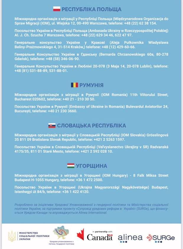 Окрім того, подані корисні контакти, куди можуть звернутись по допомогу жінки в країнах ЄС – Угорщині, Польщі, Румунії, Словаччині.