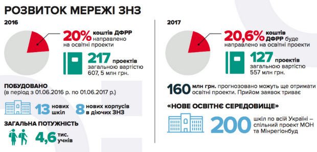 У 2016 році на розвиток мережі шкіл з Державного фонду регіонального розвитку будо витрачено понад 607 млн грн, що також склало близько 20% загального бюджету фонду. За період з 1 червня 2016 року до 1 червня 2017 року було побудовано 13 нових шкіл та 8 додаткових корпусів для уже діючих шкіл загальною потужністю 4,6 тисяч учнів.
