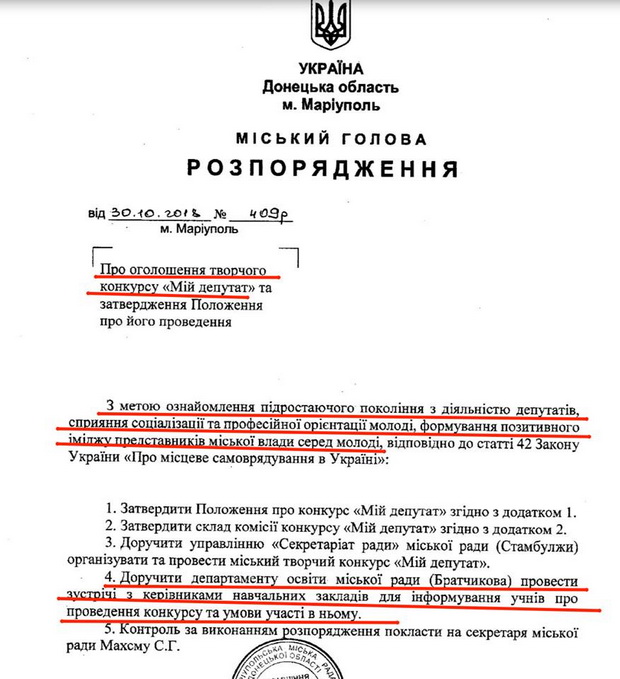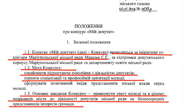 У Маріуполі заснували творчий конкурс для дітей «Мій депутат». Про це повідомив координатор ініціативної групи «Вместе» Петро Андрющенко з посиланням на розпорядження маріупольського міського голови.