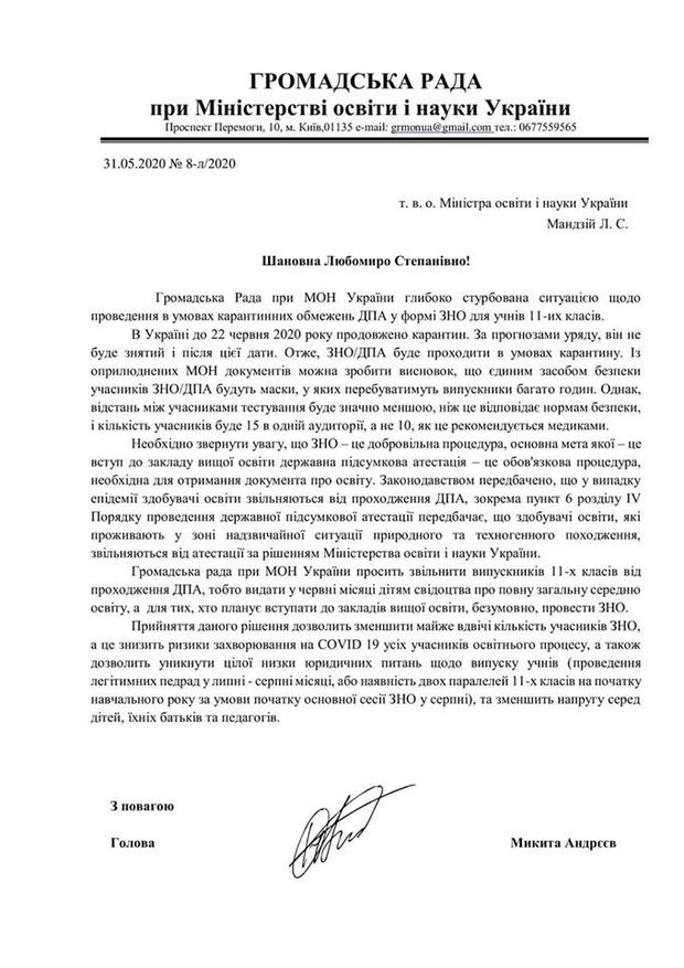 «Громадська рада при МОН України просить звільнити випускників 11-х класів від проходження ДПА, тобто видати у червні місяці дітям свідоцтва про повну загальну середні освіту, а для тих, хто планує вступати до закладів вищої освіти, безумовно, провести ЗНО», - йдеться у листі.
