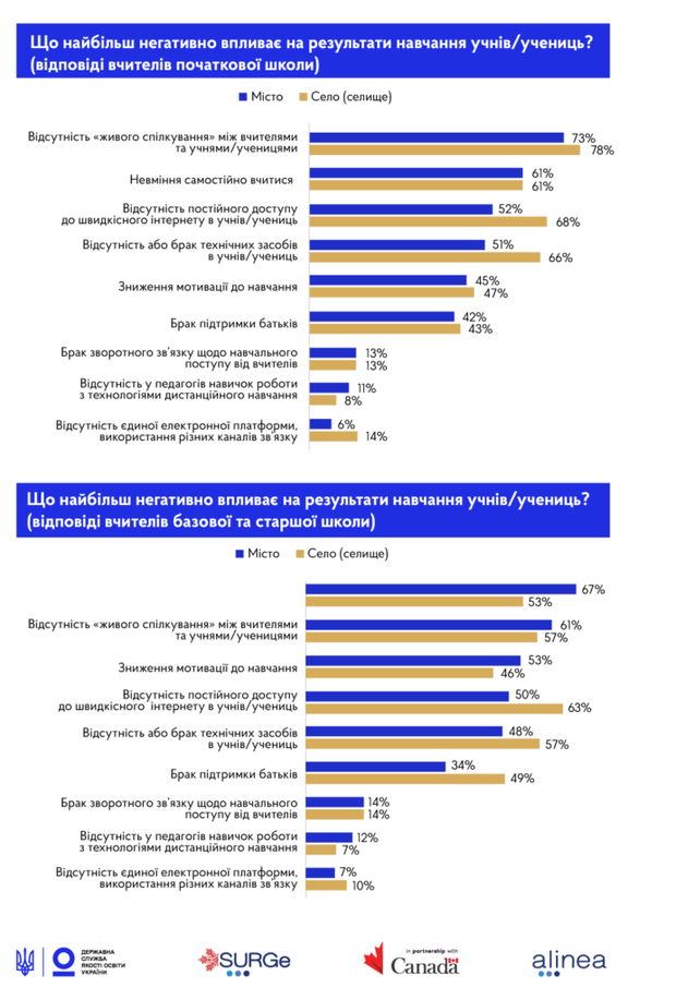 Серед чинників, які негативно впливають на результати навчання учнів / учениць в умовах дистанційного навчання, учителі насамперед називають відсутність «живого спілкування»: 73% вчителів про це зазначили у містах та 78% у селах – для початкової школи, та 61% і 57% відповідно – для базової та старшої.