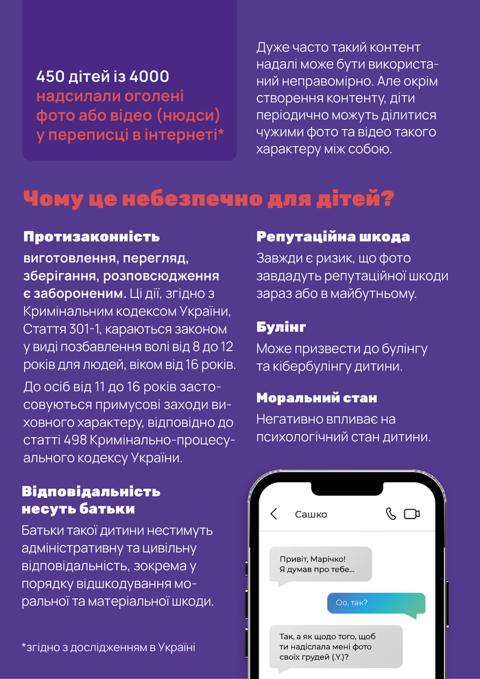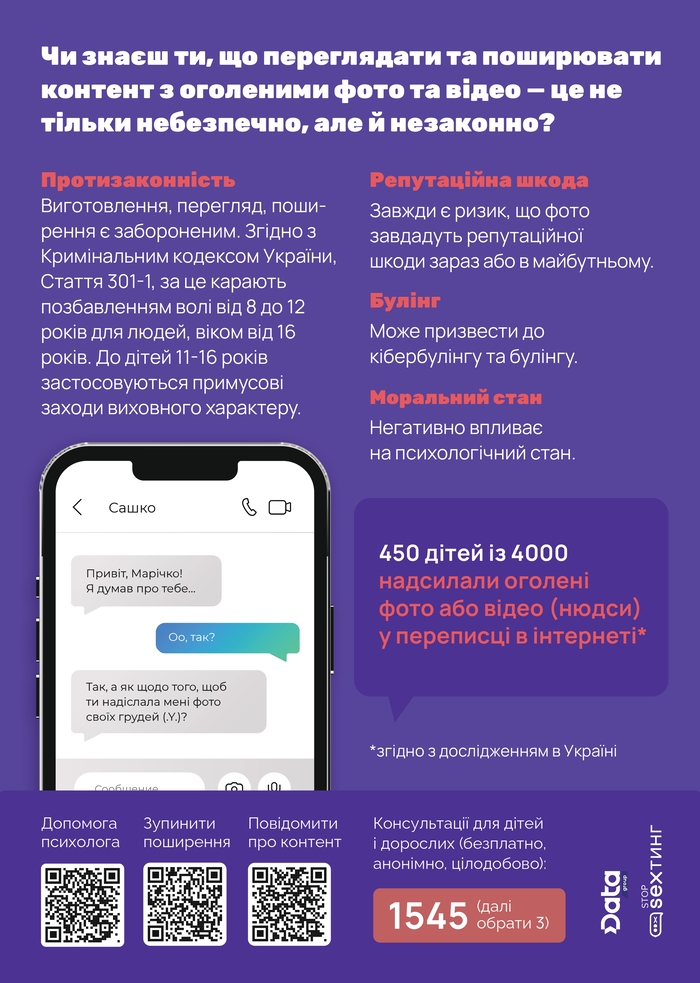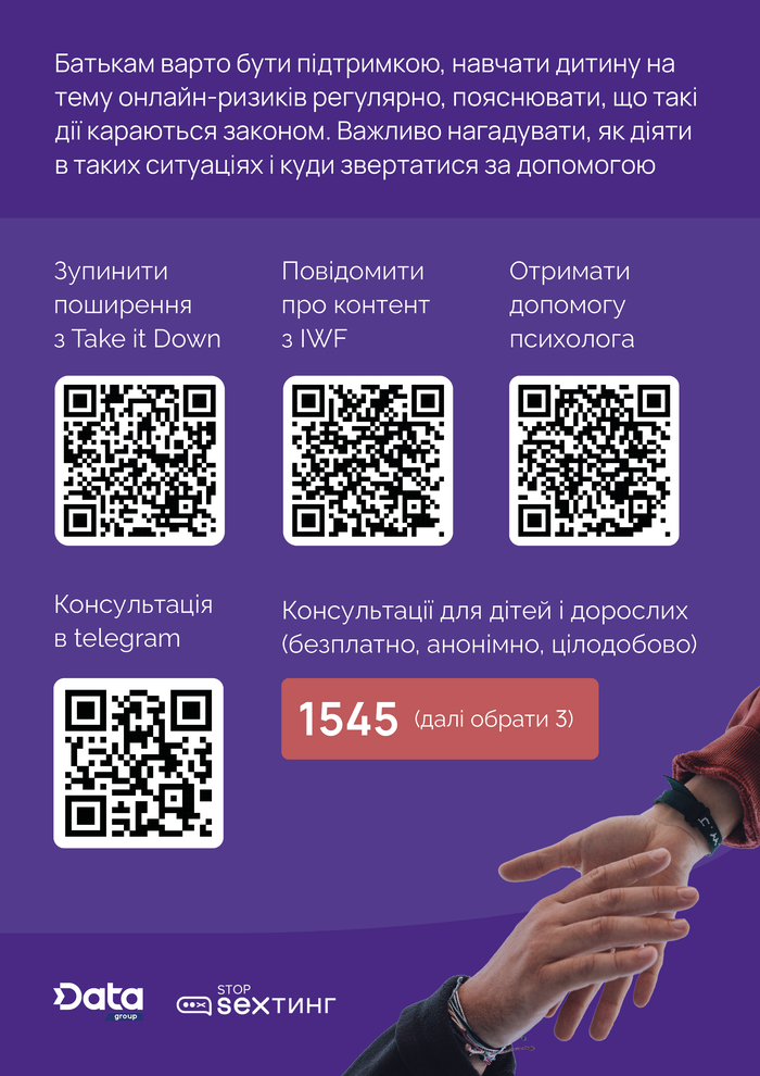 Діти та батьки можуть поговорити з психологом #stop_sexтинг: https://stop-sexting.in.ua/adult/psykholoh/ та в Телеграм.