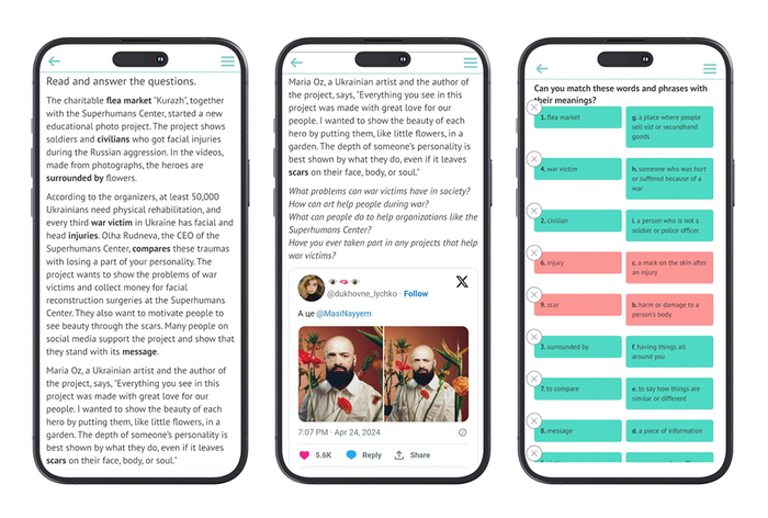 Сьогодні підручник містить понад 24 формати інтерактивних завдань: картки для вивчення слів, вправи на кшталт matching і drag&drop, тести множинного вибору, вправи на правопис, ігри на пам’ять тощо. Такий різноплановий підхід дозволяє врахувати індивідуальні стилі навчання: хтось краще запам’ятовує візуально, хтось – через гру чи практику.