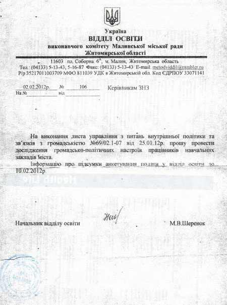 За інформацією Яценюка, відділ освіти виконавчого комітету Малинської міськради Житомирської області доручив керівникам усіх місцевих загальноосвітніх навчальних закладів провести дослідження громадсько-політичних настроїв працівників.